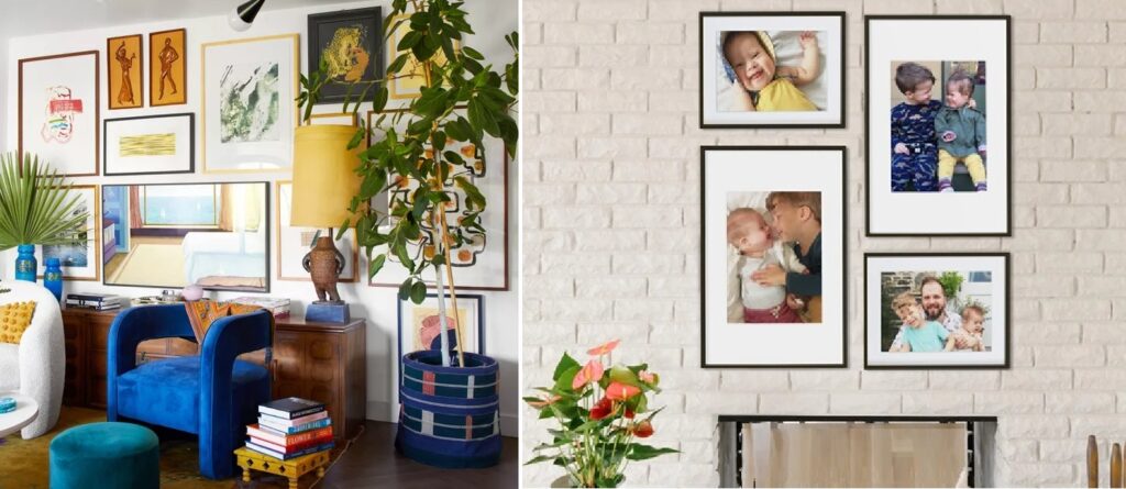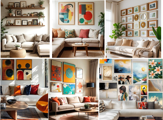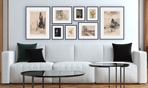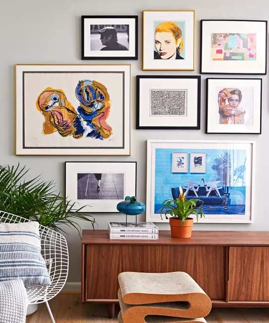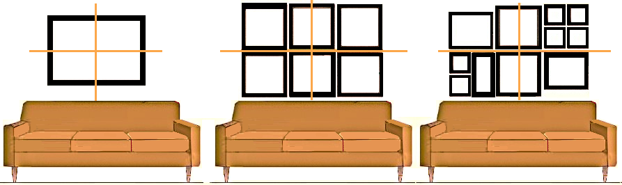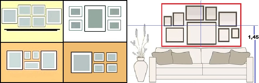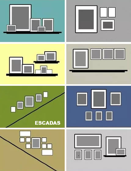 Os quadros sempre são organizados a partir de um eixo central, as molduras nem sempre precisam ser idênticas, mas tem que haver harmonia na disposição dos quadros.