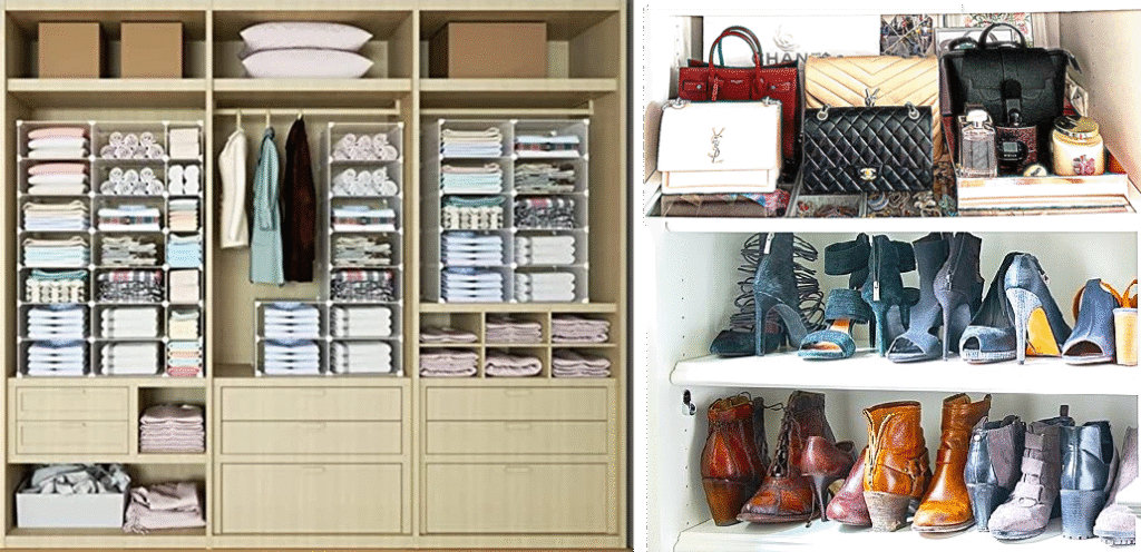 Organize bolsas e sapatos separando-os por tipo, frequência de uso, tamanho, ou cor, aproveitando o espaço vertical com prateleiras ou organizadores suspensos e caixas transparentes, ganchos e divisórias de prateleira. E também maximizar o espaço com organizadores embaixo da cama, ou nichos no armário. Guarde as bolsas em saquinhos de malha de algodão e os sapatos em pares. Alinhe as bolsas em prateleiras, colocando as menos usadas mais acima e as bolsas de uso diário mais abaixo. Utilize nichos para dar a cada bolsa um espaço dedicado. Encha as bolsas com papel de seda, para evitar que elas fiquem amassadas e para facilitar o acesso.