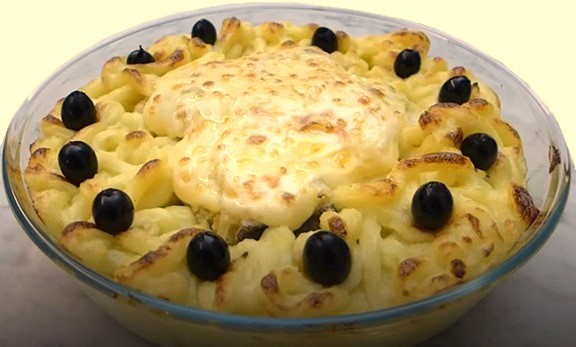 Corte e coloque as postas de bacalhau de molho trocando a água a cada 1 hora, por 3 a 4 horas até dessalgar. Cozinhe o bacalhau em 2 xícaras de leite por 10 minutos contados a partir do momento em que o leite levanta fervura. Retire do fogo para uma travessa refratária untada com azeite e reserve o leite. Cozinhe as batatas, na água e sal. por 40 minutos e ainda quentes faça um purê com o leite do cozimento do bacalhau (ainda quente) e a manteiga em fogo baixo. Numa frigideira coloque o azeite e frite o alho e as cebolas cortadas em rodelas. Quando as cebolas estiverem ligeiramente douradas misture no bacalhau. Coloque o puré de batata num saco plástico e distribua em volta do bacalhau e espalhe a maionese sobre bacalhau. Leve ao forno para gratinar pré-aquecido a 200° por 15 minutos ou até gratinar. E cubra com as azeitonas e os ovos cozidos cortados em rodelas.